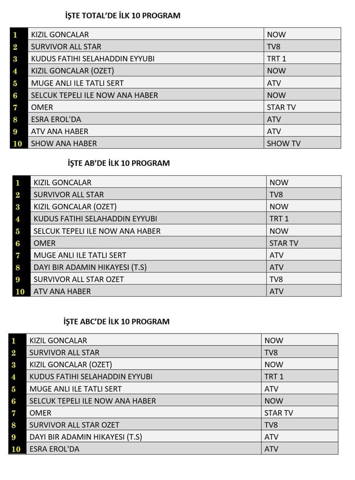 Her gün bir önceki güne ait Total, AB ve ABC sıralaması belli olurken dünün reyting sonuçları merakla bekleniyor.