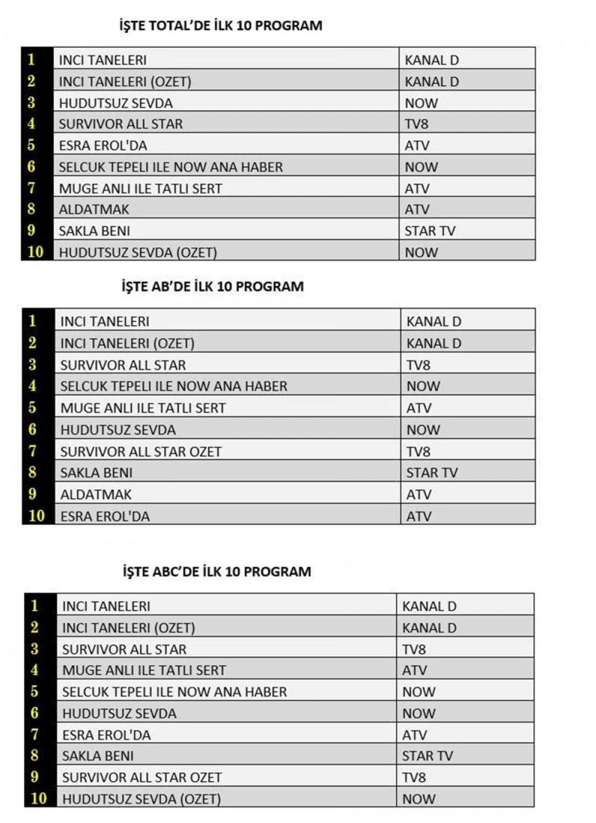 Her gün bir önceki güne ait Total, AB ve ABC sıralaması belli olurken dünün reyting sonuçları merakla bekleniyor.