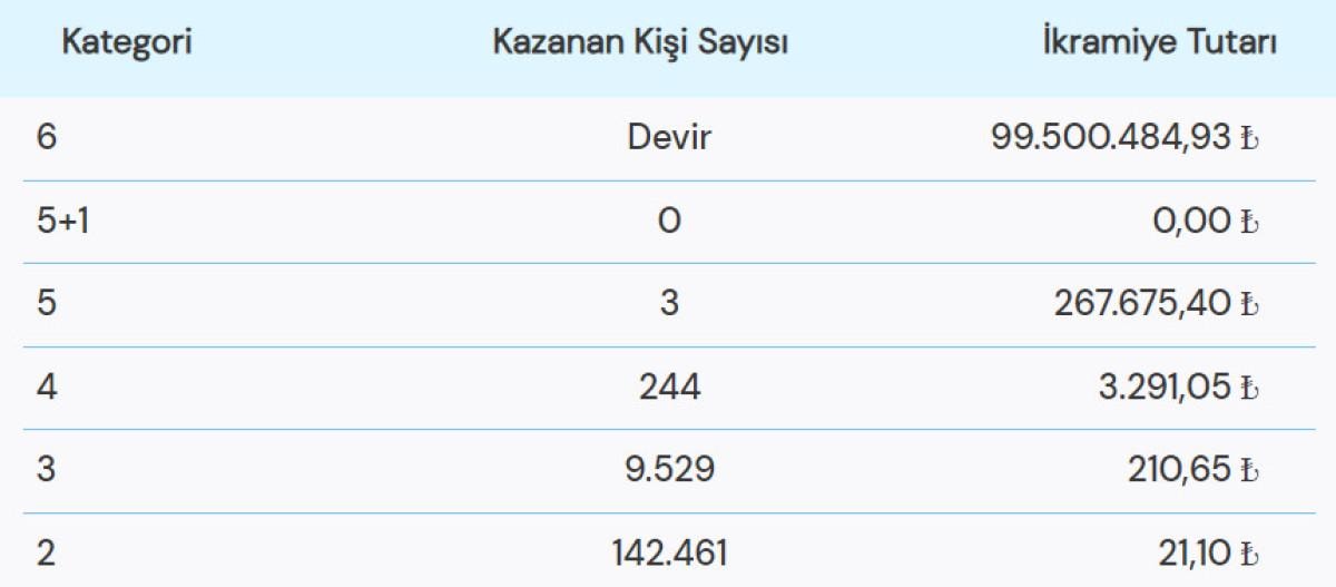 Büyük ikramiyenin 99.500.484,93 TL olduğu çekilişte 6 bilen çıkmadığı için büyük ikramiye devretti.