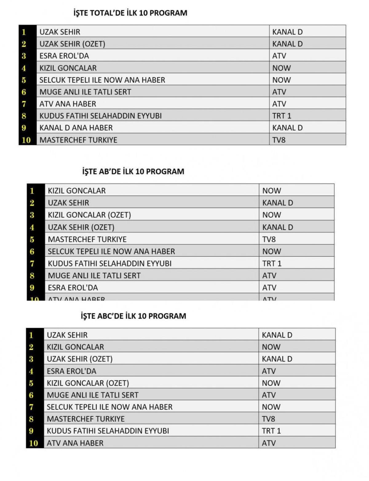 Her gün bir önceki güne ait Total, AB ve ABC sıralaması belli olurken dünün reyting sonuçları merakla bekleniyor.