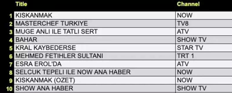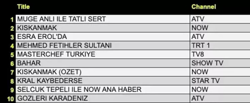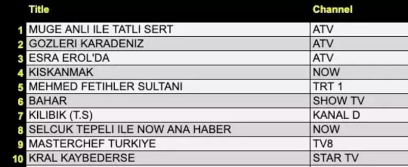 Her gün bir önceki güne ait Total, AB ve ABC sıralaması belli olurken dünün reyting sonuçları merakla bekleniyor.