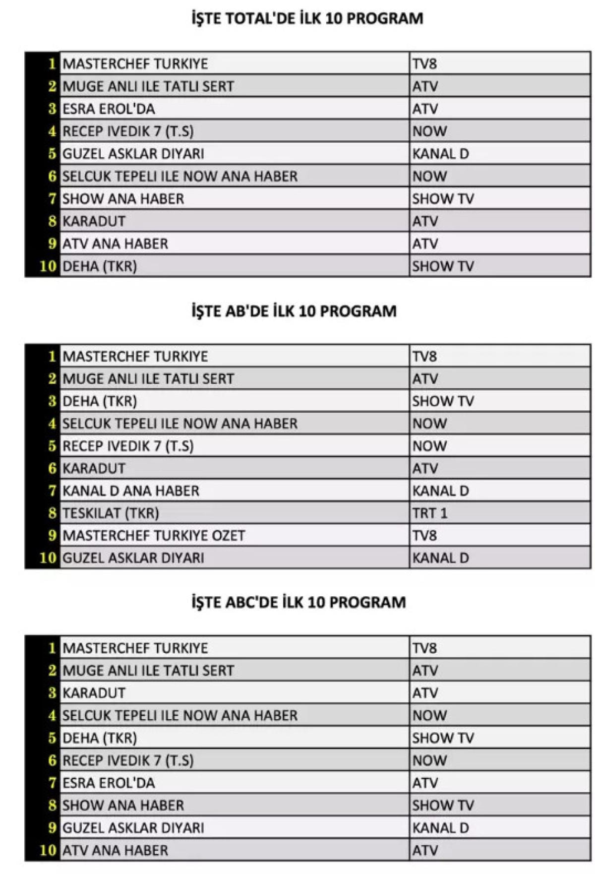 Her gün bir önceki güne ait Total, AB ve ABC sıralaması belli olurken dünün reyting sonuçları merakla bekleniyor.