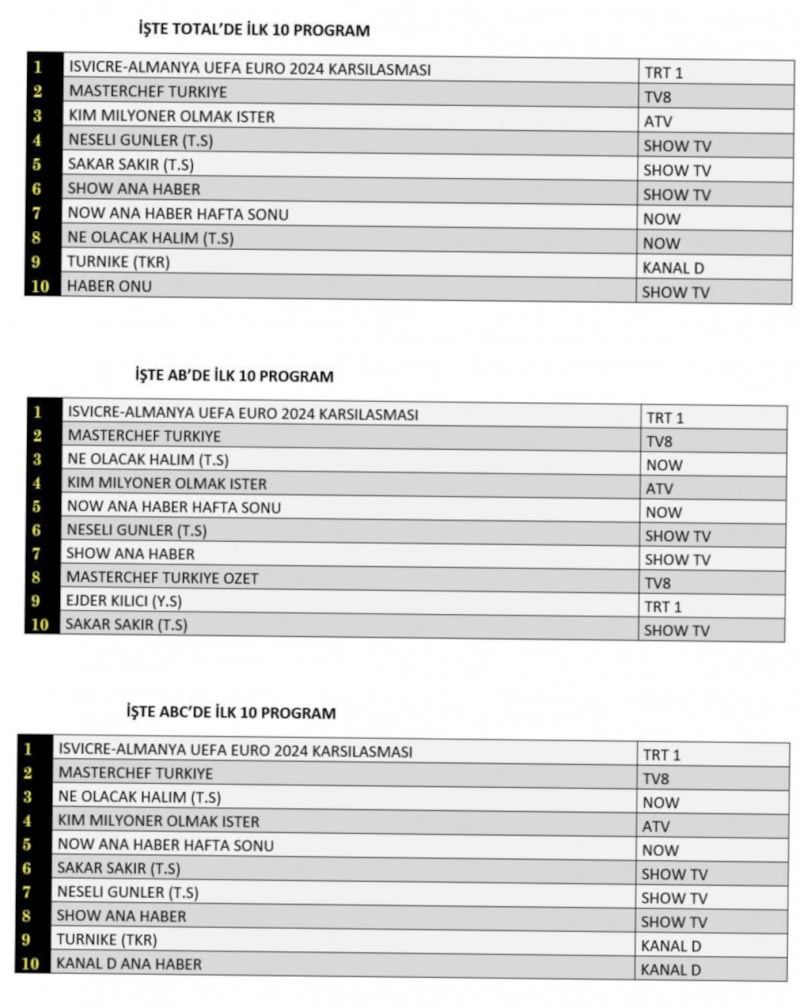 AB'de birinci sırada İsviçre Almanya UEFA EURO 2024 Karşılaşması, ikinci sırada Masterchef Türkiye, üçüncü sırada Ne Olacak Halim yer aldı.