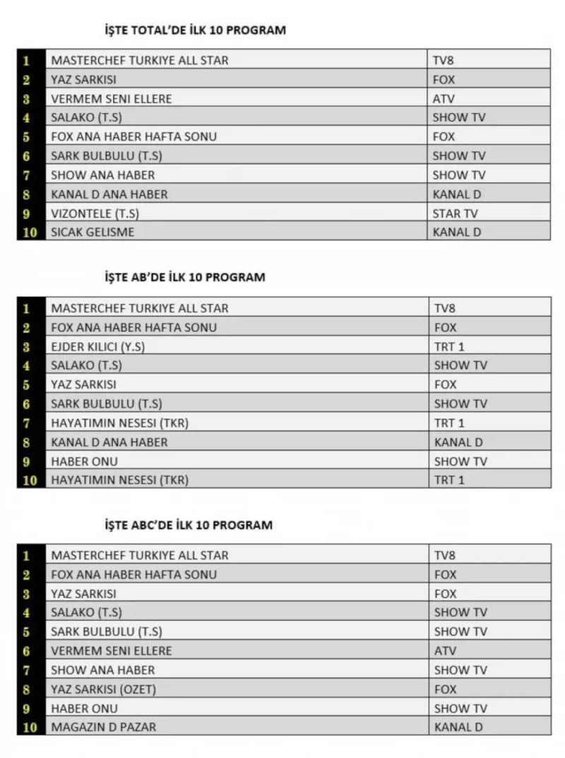 Her gün bir önceki güne ait Total, AB ve ABC sıralaması belli olurken dünün reyting sonuçları merakla bekleniyor.