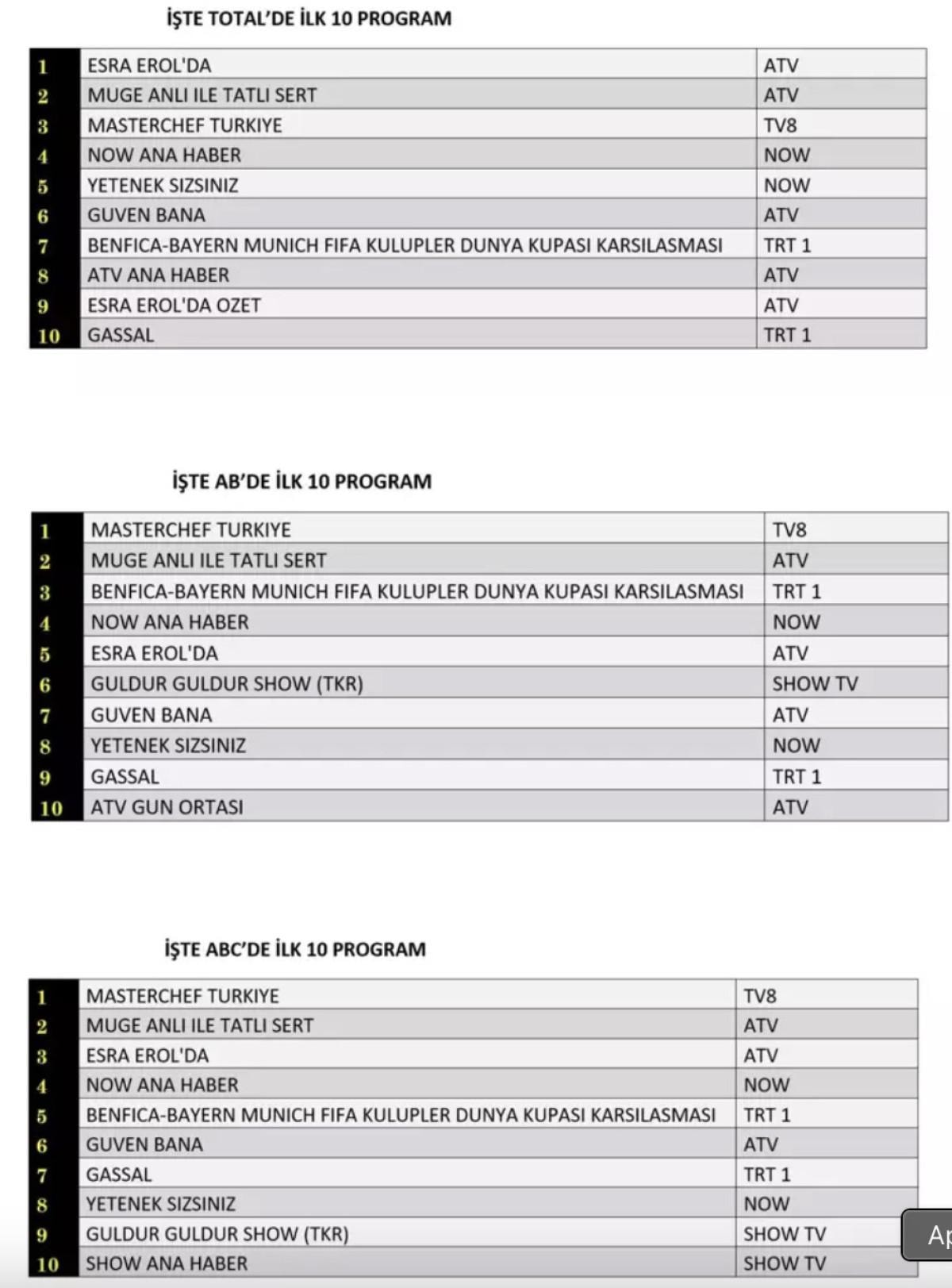 Her gün bir önceki güne ait Total, AB ve ABC sıralaması belli olurken dünün reyting sonuçları merakla bekleniyor.