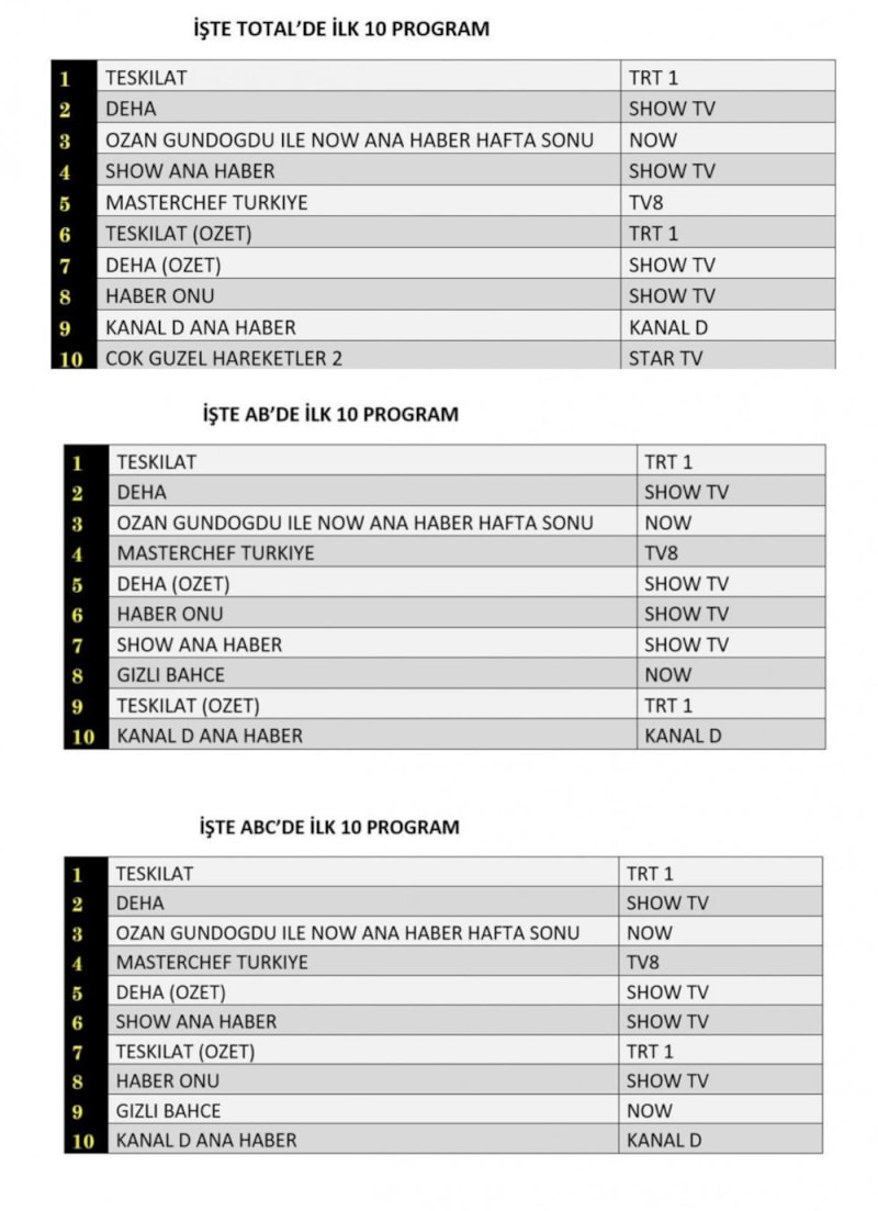 ABC katagorisinde 1. Sırada: Teşkilat, 2. Sırada: Deha, 3. Sırada: Ozan Gündoğdu ile Now Ana Haber Hafta Sonu yer aldı.