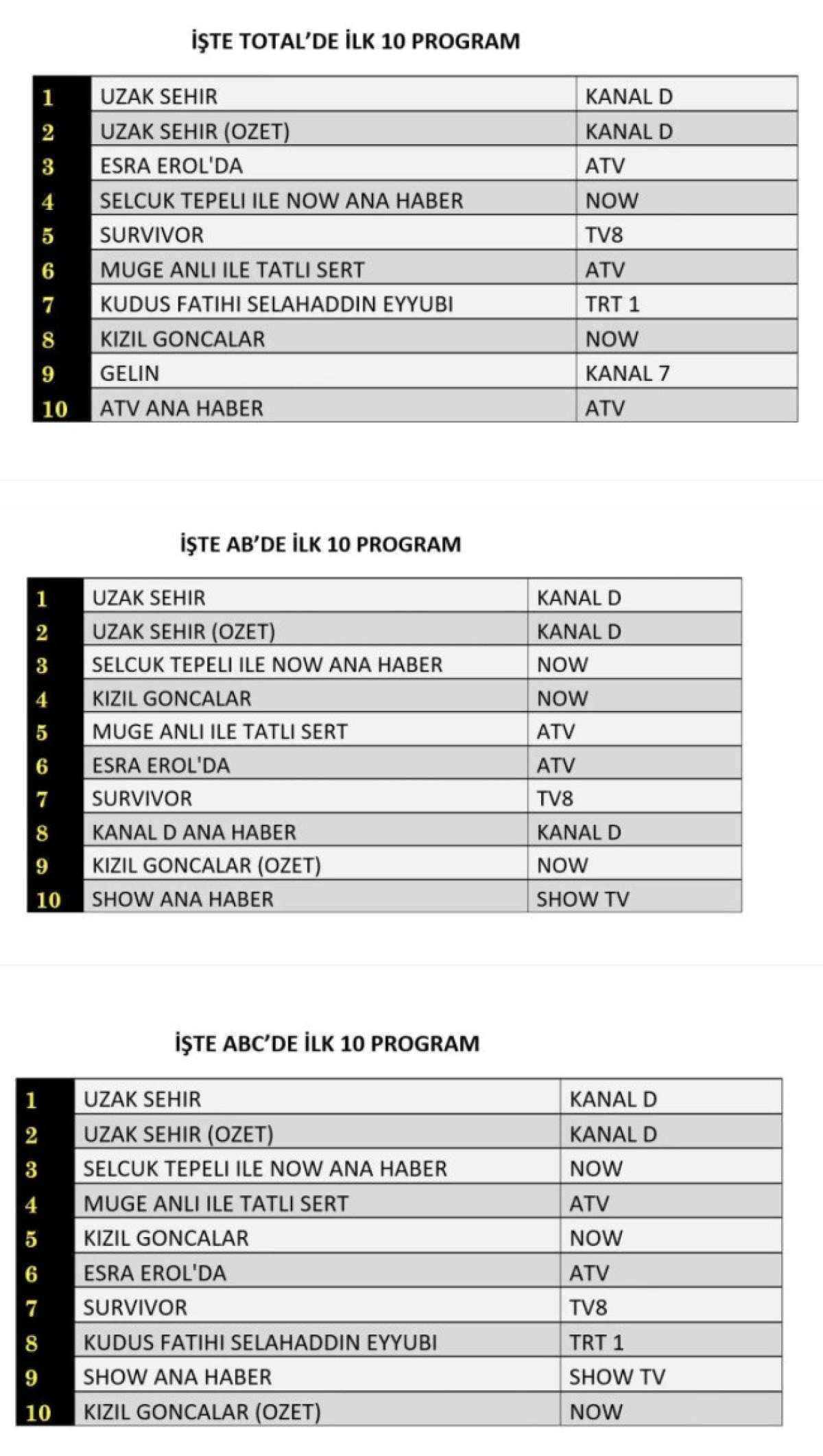 Her gün bir önceki güne ait Total, AB ve ABC sıralaması belli olurken dünün reyting sonuçları merakla bekleniyor.