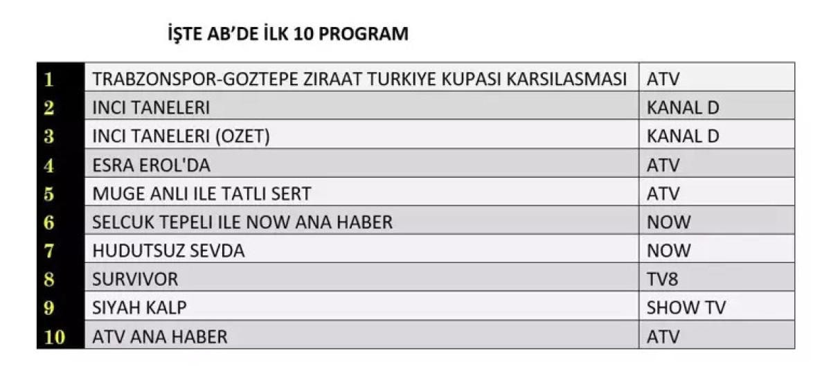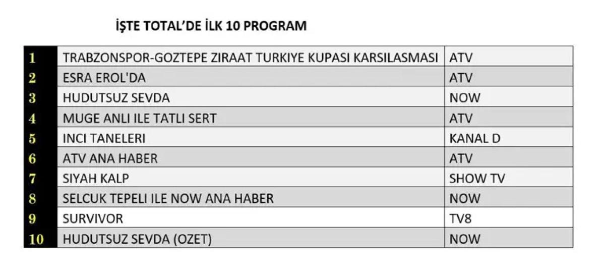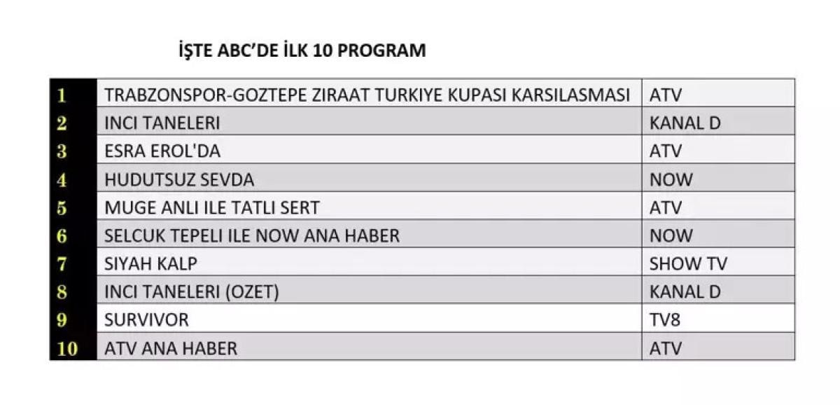 Trabzonspor - Göztepe Ziraat Türkiye Kupası yarı final maçı, tüm kategorilerde zirveyi kaptı. İnci Taneleri dizisi ise AB ve ABC gruplarında ikinci sıraya yerleşti. Total'de ikinci sırayı Esra Erol'da kaptı.