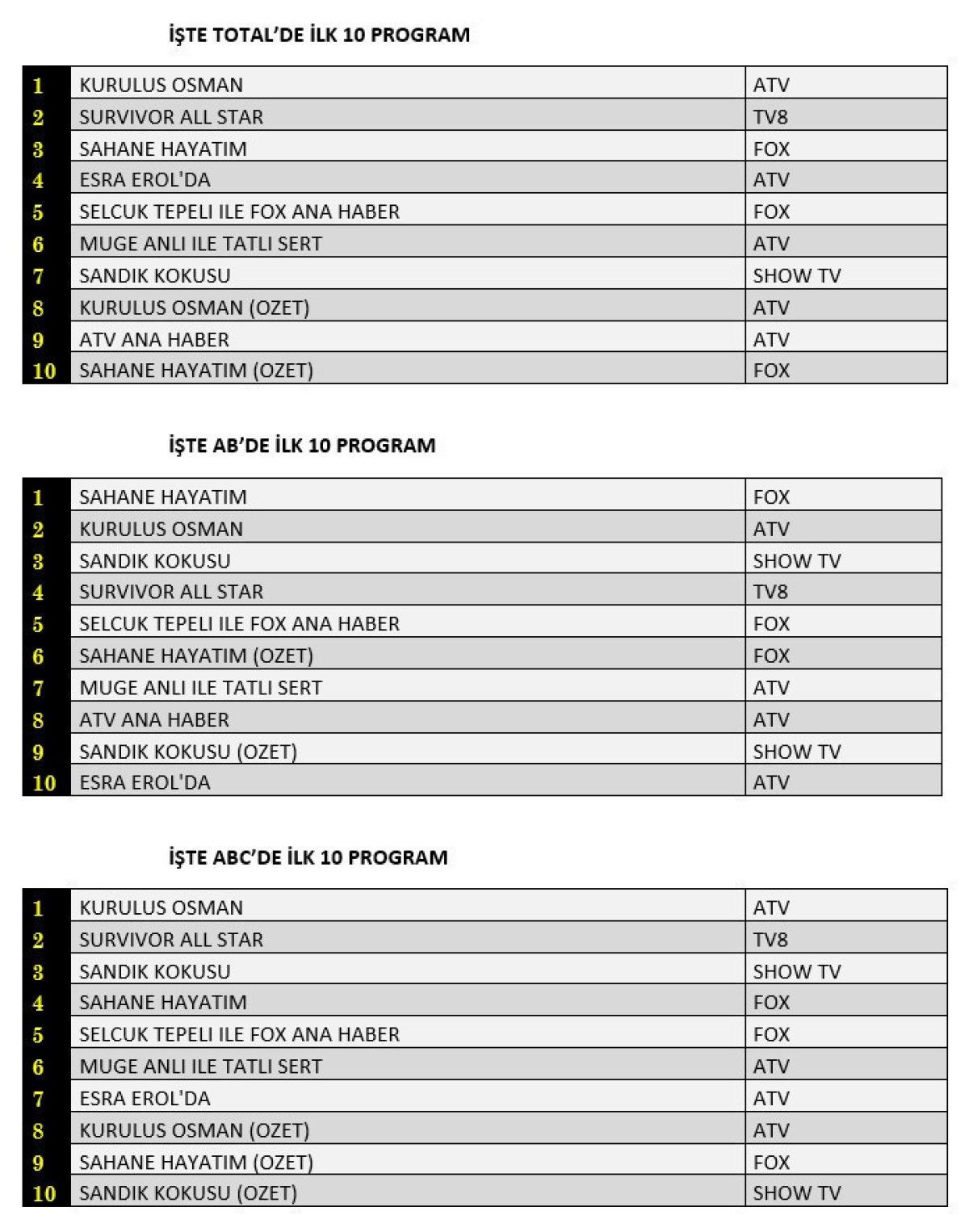 AB'de ise 1.sırada “Şahane Hayatım”, 2.sırada “Kuruluş Osman”, 3.sırada Show TV’de yayınlanan “Sandık Kokusu” yer aldı.