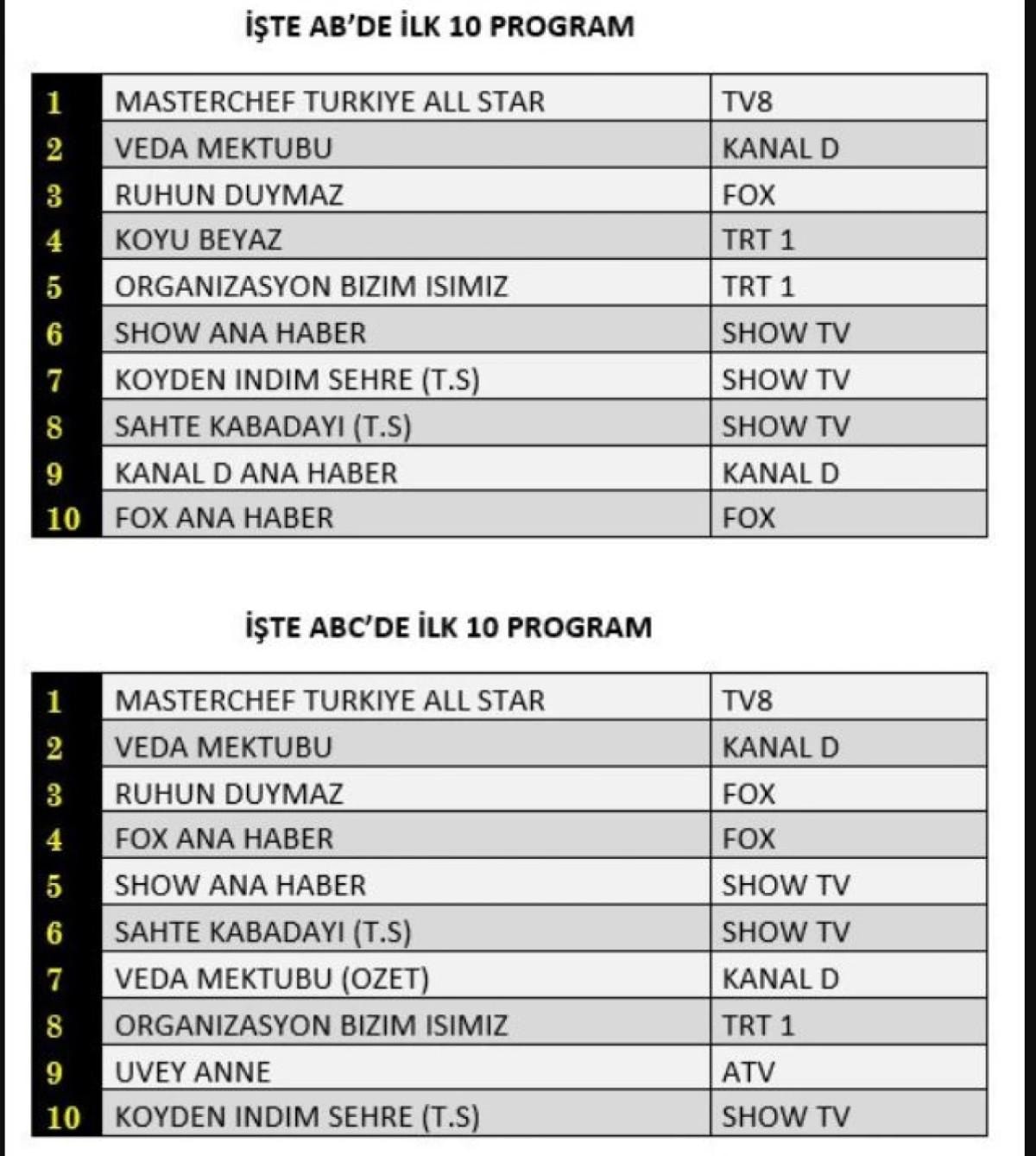 AB'de ilk sırada Masterchef Türkiye All Star, ikinci sırada Veda Mektubu, üçüncü sırada Ruhun Duymaz yer aldı.