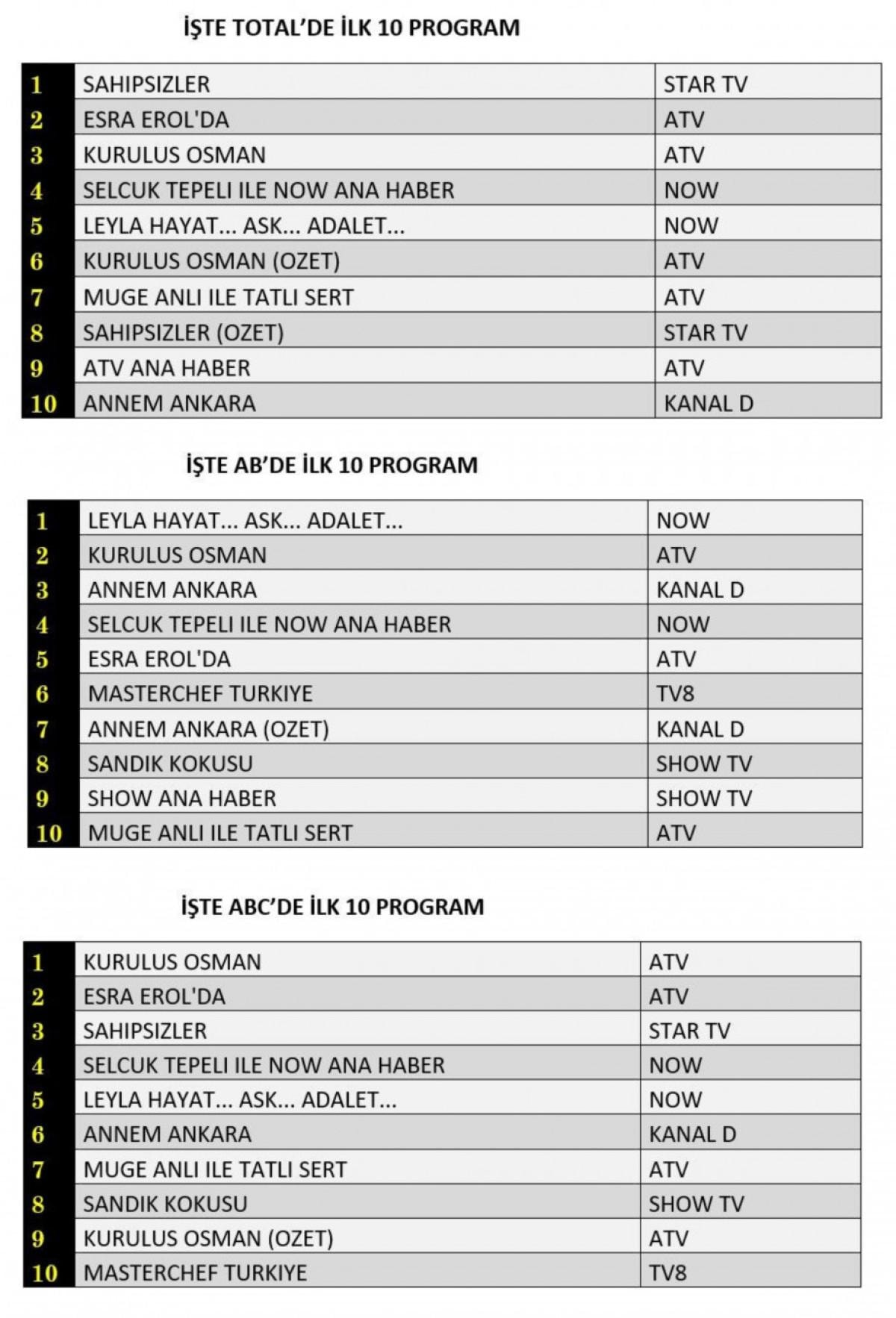 ABC kategorisinde ise Kuruluş Osman liderliğini korurken, Esra Erol’da ikinci sırada, Sahipsizler üçüncü sırada yer aldı.