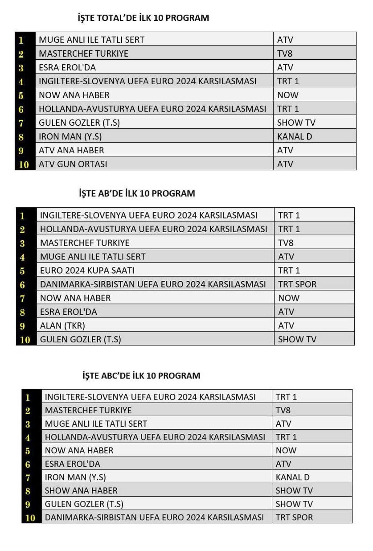 AB'de birinci sırada İngiltere Slovenya UEFA EURO 2024 Karşılaşması, ikinci sırada Hollanda Avusturya maçı, üçüncü sırada Müge Anlı yer aldı.