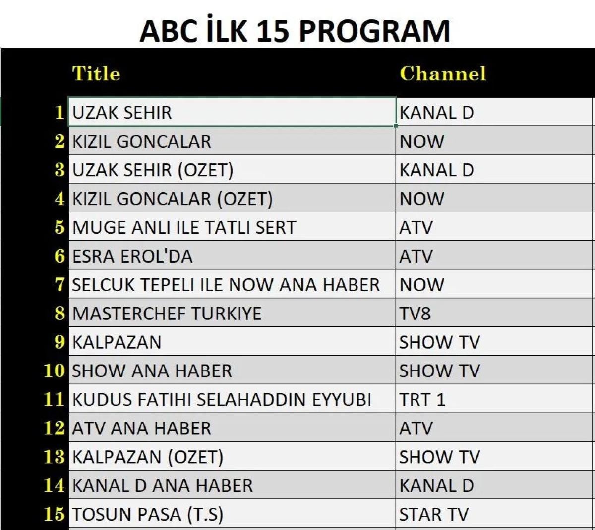 Her gün bir önceki güne ait Total, AB ve ABC sıralaması belli olurken dünün reyting sonuçları merakla bekleniyor.