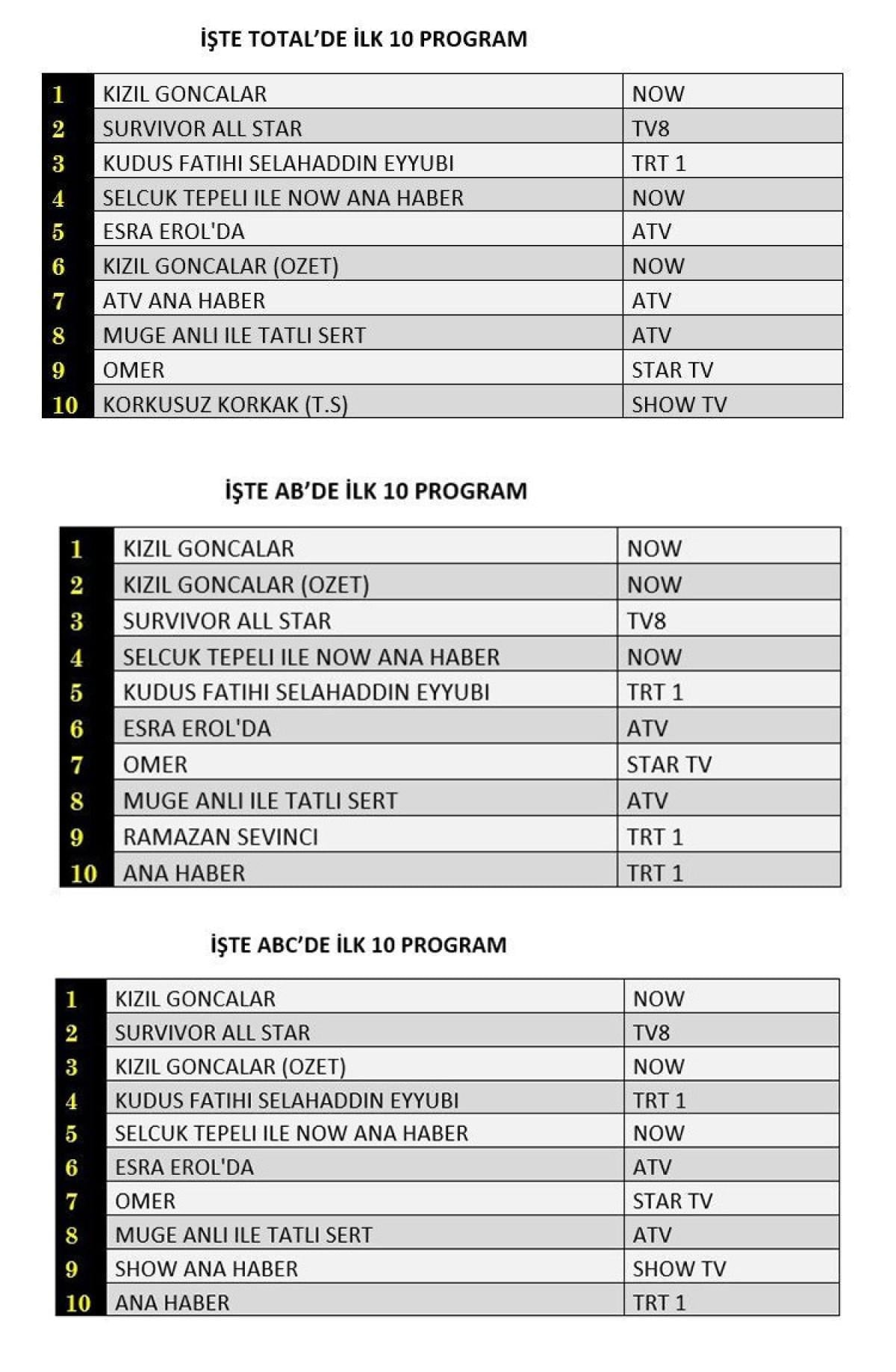 AB'de ise 1.sırada “Kızıl Goncalar”, 2.sırada “Survivor All Star”, 3.sırada Kızıl Goncalar” dizisinin özeti yer aldı.