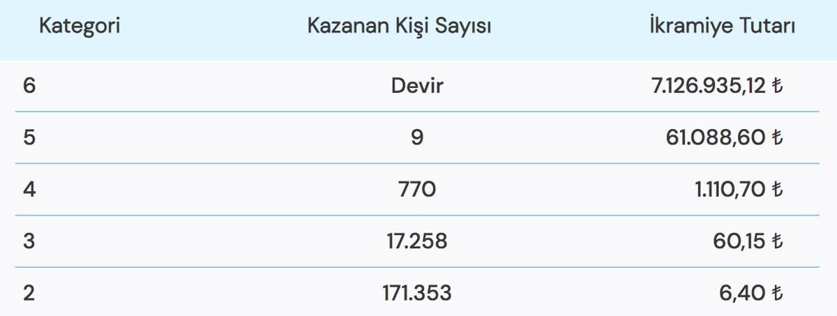 Büyük ikramiyenin 7.126.935,12 TL olduğu çekilişte 6 bilen çıkmadığı için büyük ikramiye devretti. İşte çekiliş sonuçlarına göre ikramiye kazanan kişi sayısı ve kazandıkları ikramiye tutarları..
