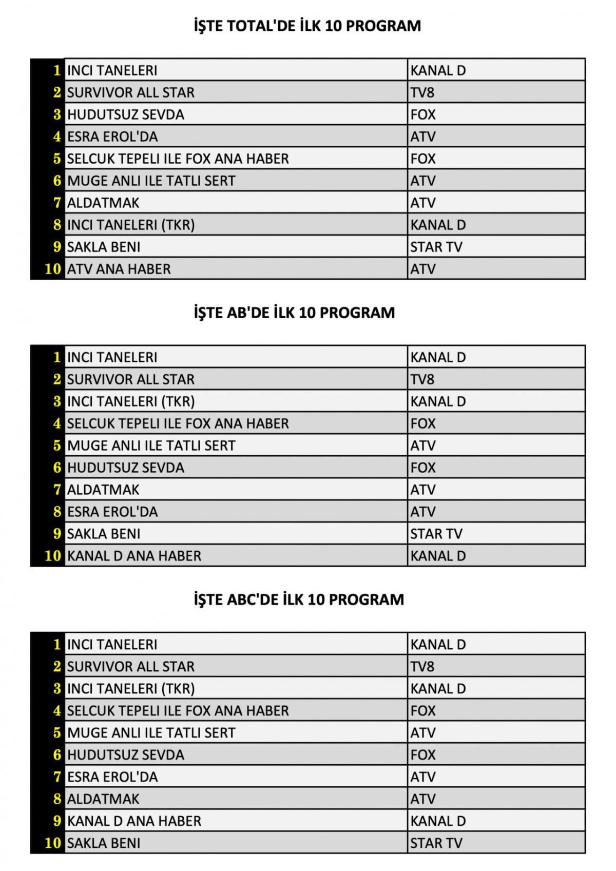 Total’de 1. sırada Kanal D’de izleyici ile buluşan “İnci Taneleri”, 2. sırada TV8’de ekranlara gelen “Survivor All Star”, 3. sırada ise Fox’ta yayınlanan “Hudutsuz Sevda” yer aldı.
