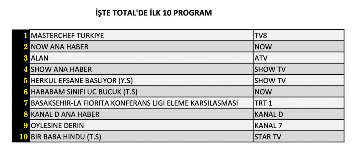 Total’de 1. sırada tv8’de izleyici ile buluşan “MasterChef Türkiye” yer aldı. 2. sırada Now’da ekranlara gelen “NOW Ana Haber” yer aldı. 3. sırada ise atv’de yayınlanan “Alan” programı yer aldı.