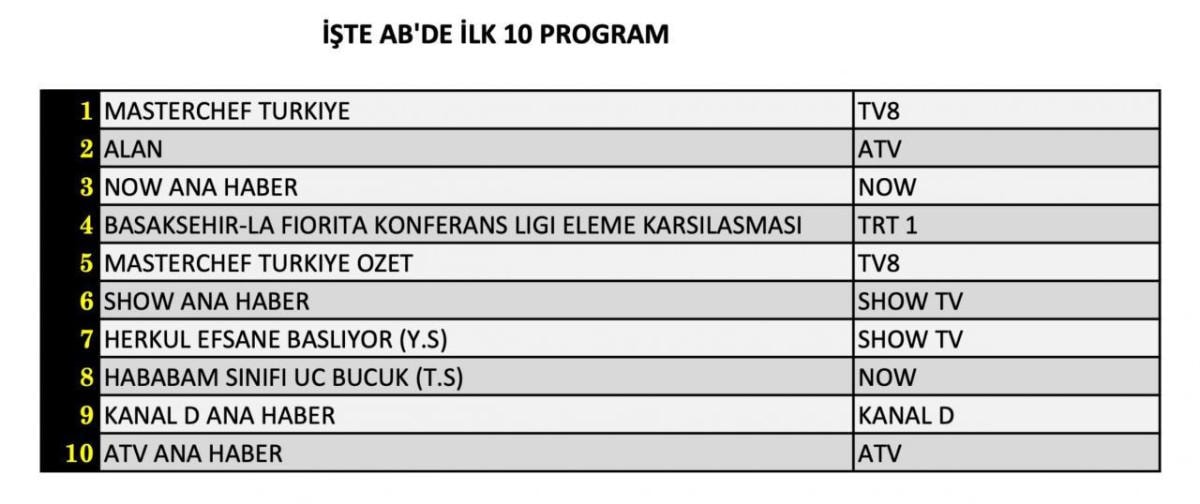 AB’de 1. sırada “MasterChef Türkiye” yer aldı. AB’de 2. sırada “Alan” yer aldı. AB 3. sırada ise “NOW Ana Haber” yer aldı.