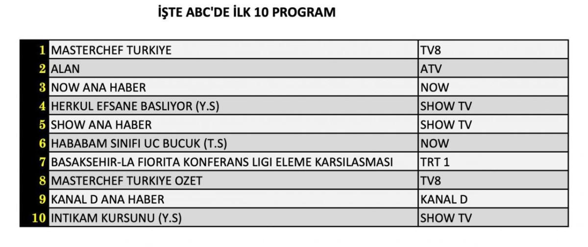 ABC’de 1. sırada “MasterChef Türkiye” yer aldı. ABC’de 2. sırada “Alan” yer aldı. ABC 3. sırada ise “NOW Ana Haber” yer aldı.