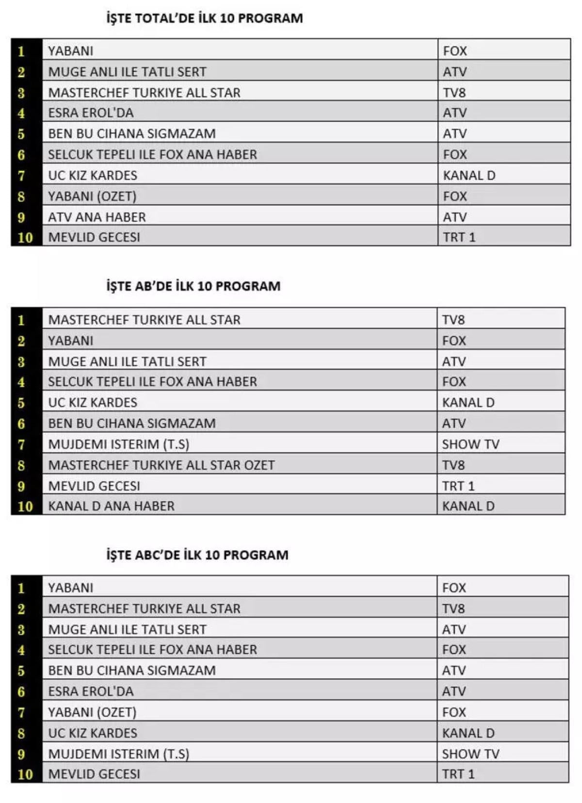 AB'de ise birinci sırada Masterchef Türkiye All Star, ikinci sırada Yabani, üçüncü sırada Müge Anlı ile Tatlı Sert yer aldı.