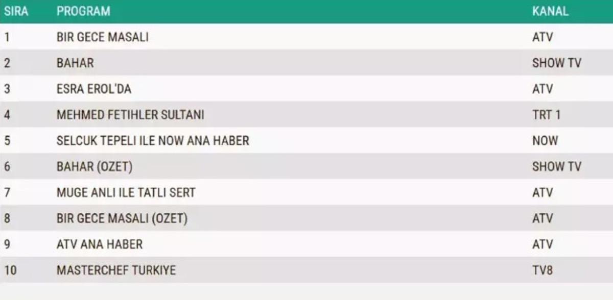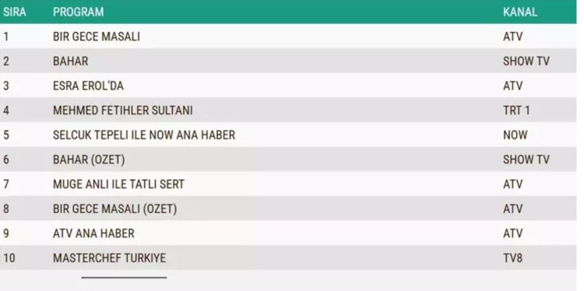 Her gün bir önceki güne ait Total, AB ve ABC sıralaması belli olurken dünün reyting sonuçları merakla bekleniyor.