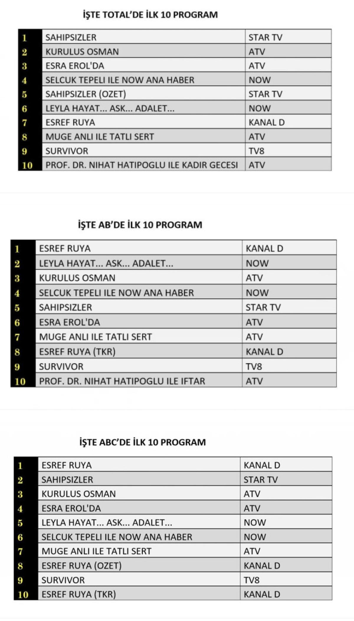 Her gün bir önceki güne ait Total, AB ve ABC sıralaması belli olurken dünün reyting sonuçları merakla bekleniyor.