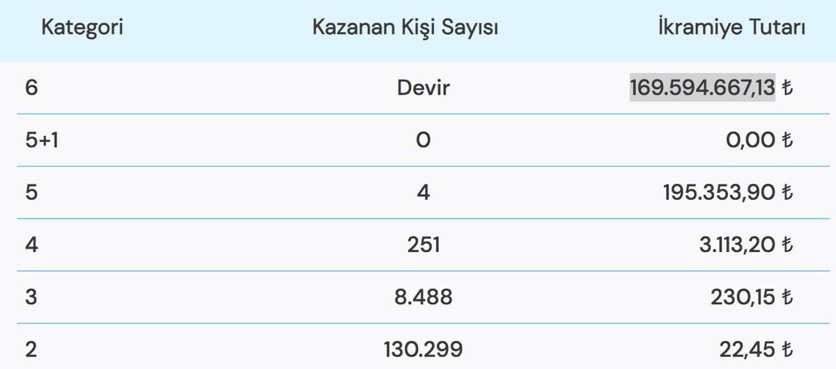 Büyük ikramiyenin 169.594.667,13 TL olduğu çekilişte 6 bilen çıkmadığı için büyük ikramiye devretti. İşte çekiliş sonuçlarına göre ikramiye kazanan kişi sayısı ve kazandıkları ikramiye tutarları..