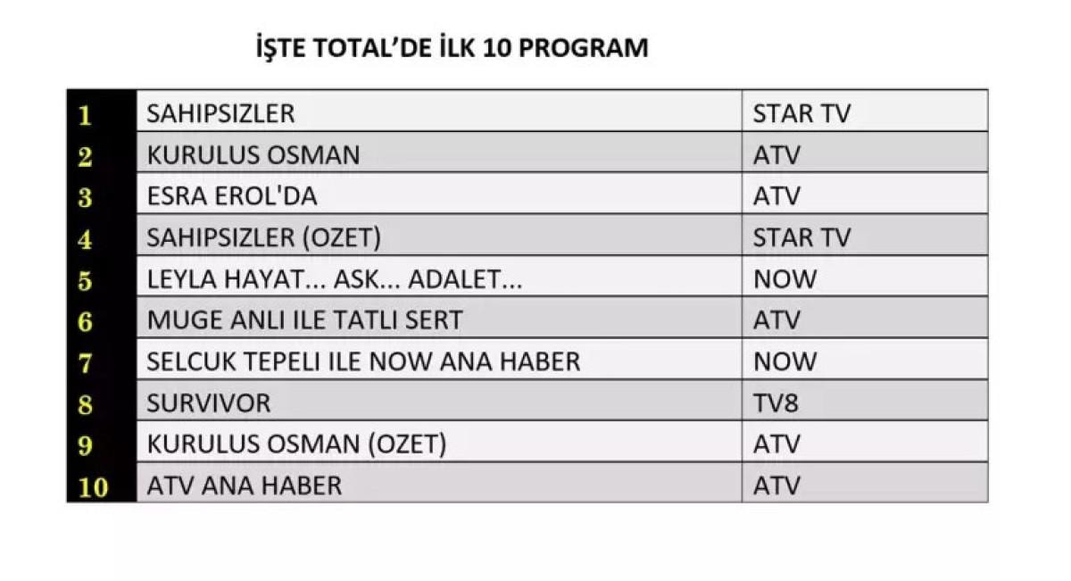 Total’de Star TV’nin sevilen dizisi Sahipsizler zirveyi kaptı. İkinci sırada Kuruluş Osman yer alırken, üçüncü sıraya Esra Erol’da programı yerleşti.