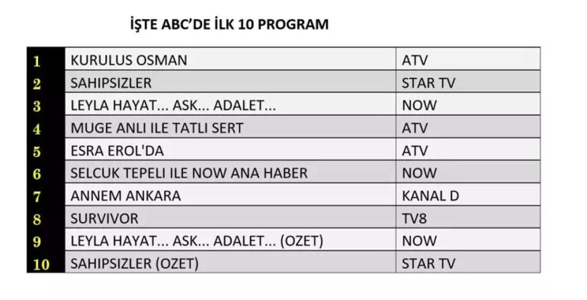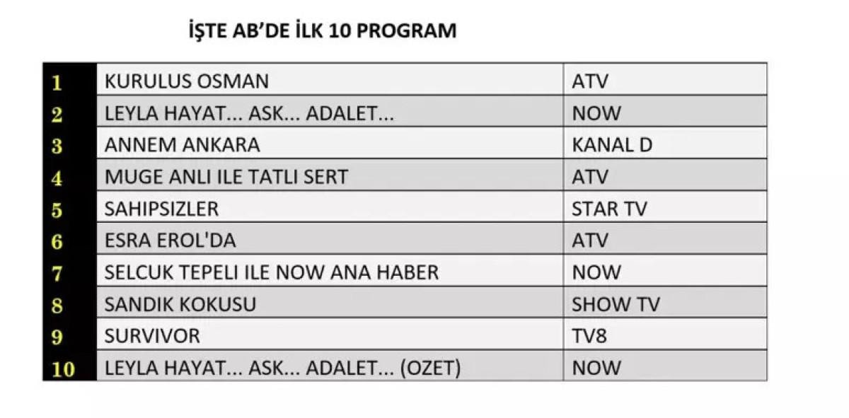 AB grubunda ise Kuruluş Osman zirvede yer aldı. İkinci sırada Leyla Hayat… Aşk… Adalet… dizisi yer aldı. Üçüncü sırayı ise Kanal D ekranlarında yayınlanan Annem Ankara dizisi kaptı.