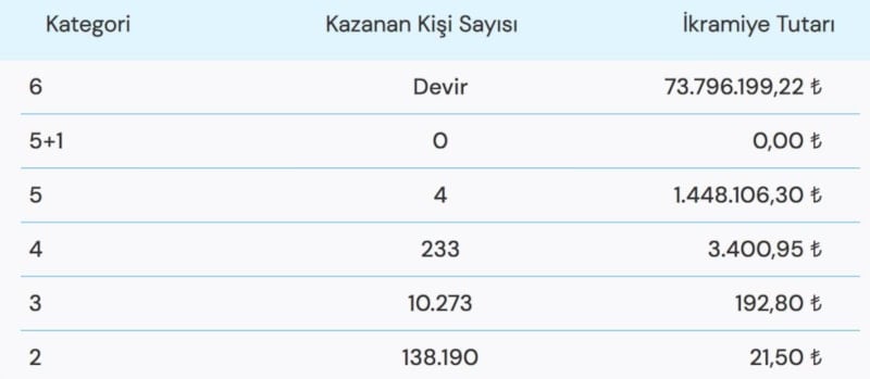 Büyük ikramiyenin 73.796.199,22 TL olduğu çekilişte 6 bilen çıkmadığı için büyük ikramiye devretti.