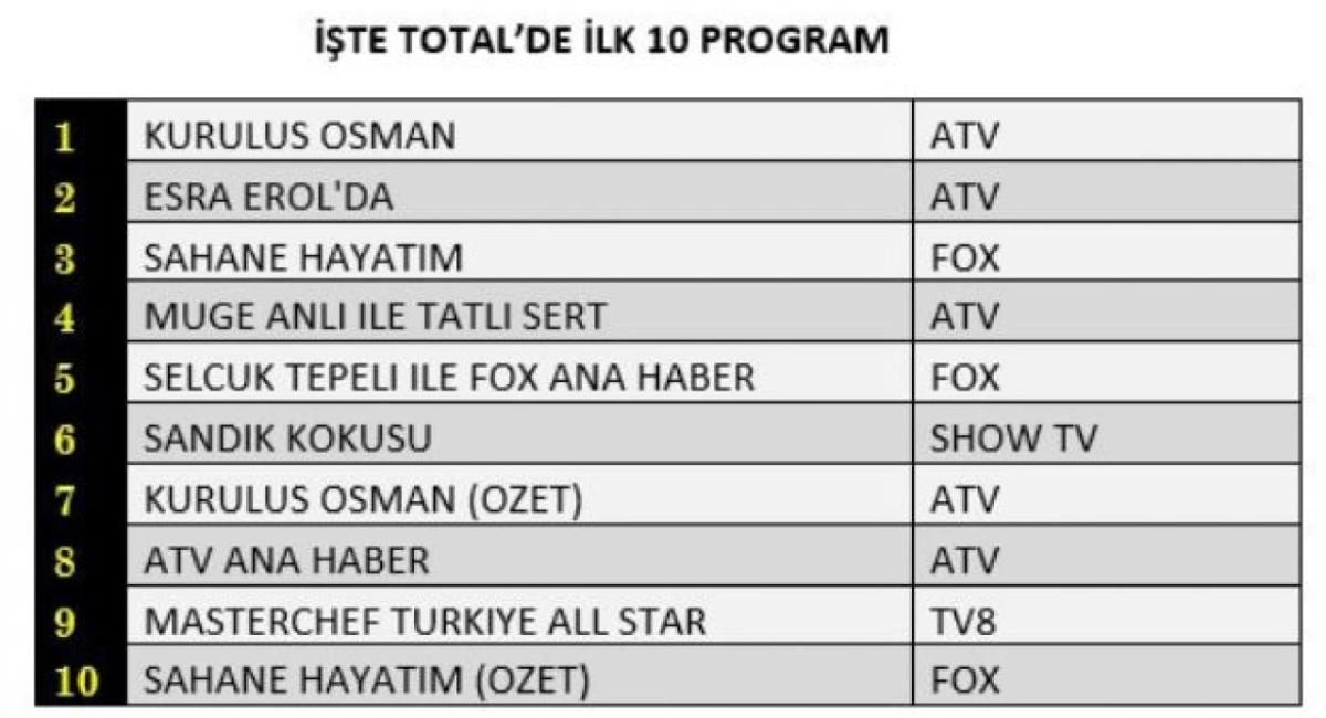 Total'de reyting listesinin ilk sırasında Kuruluş Osman, ikinci sırada Esra Erol'da, üçüncü sırada Şahane Hayatım yer aldı.
