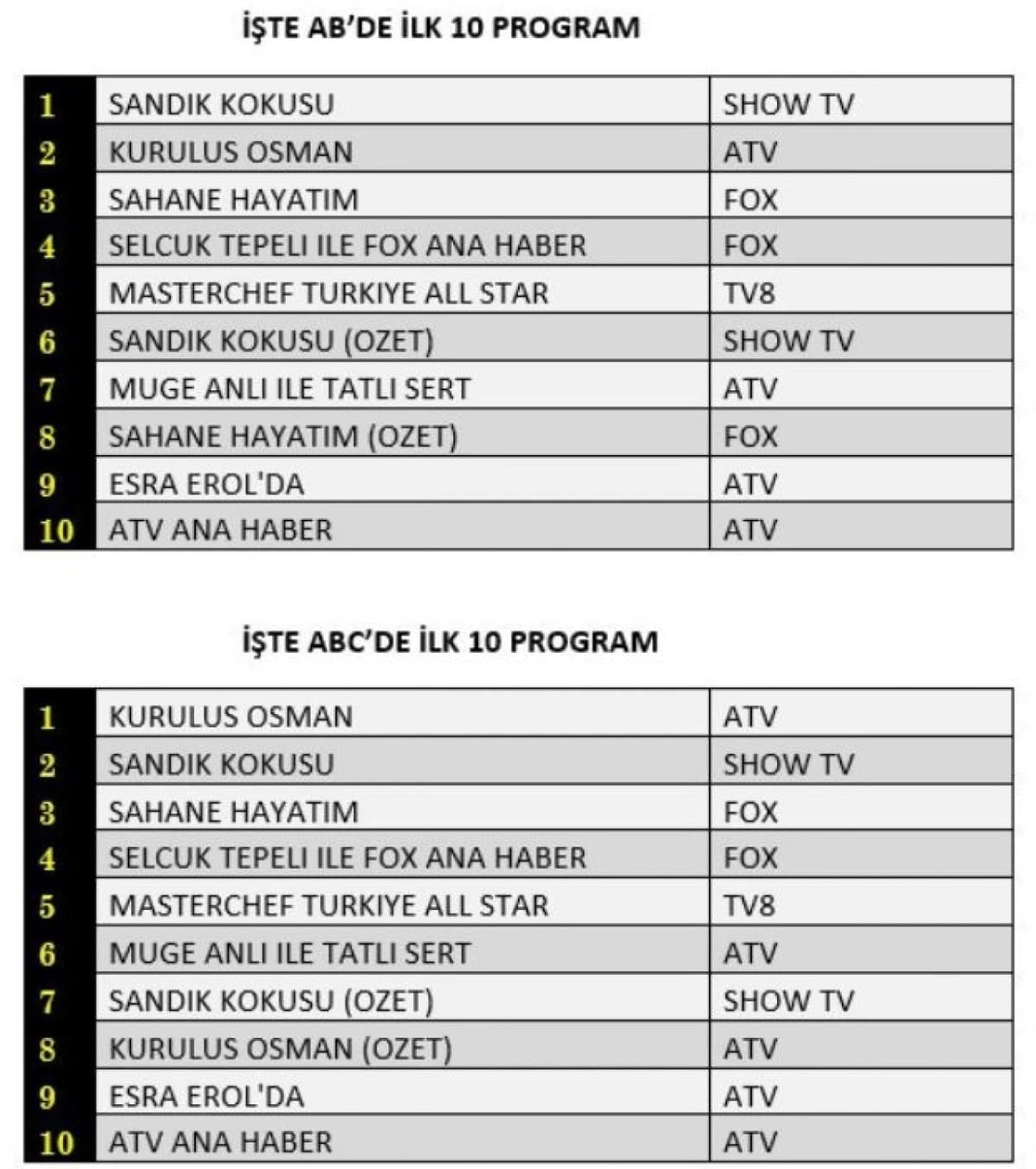 AB'de ise birinci sırada Sandık Kokusu, ikinci sırada Kuruluş Osman, üçüncü sırada Şahane Hayatım yer aldı.