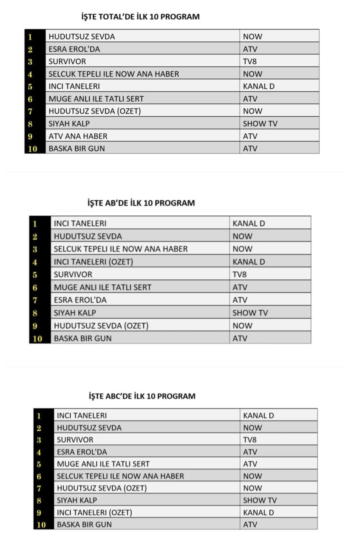 Her gün bir önceki güne ait Total, AB ve ABC sıralaması belli olurken dünün reyting sonuçları merakla bekleniyor.