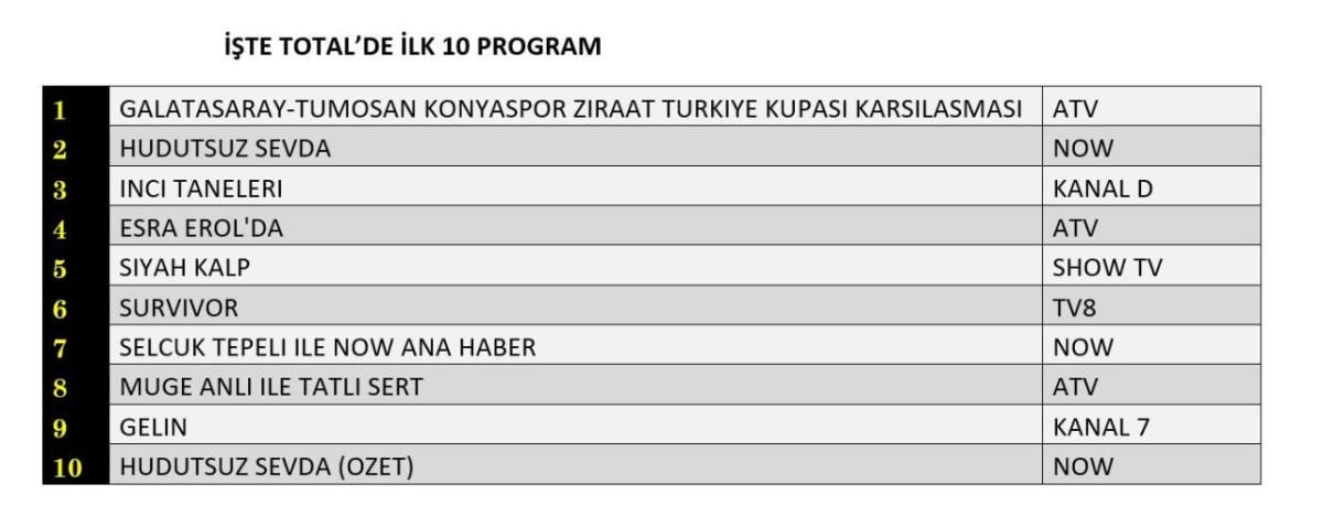 Total‘de 1.sırada atv‘de yayınlanan “Galatasaray-Tümosan Konyaspor Ziraat Türkiye Kupası Karşılaşması” karşılaşması, 2. sırada yine NOW‘da ekrana gelen Hudutsuz Sevda, 3. sırada Kanal D‘de “İnci Taneleri” ise yer aldı.
