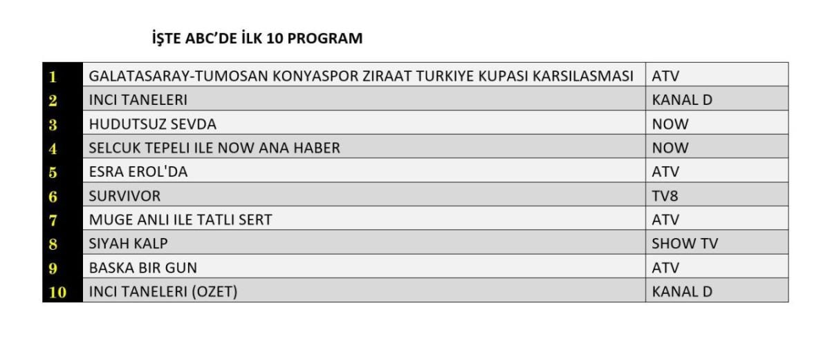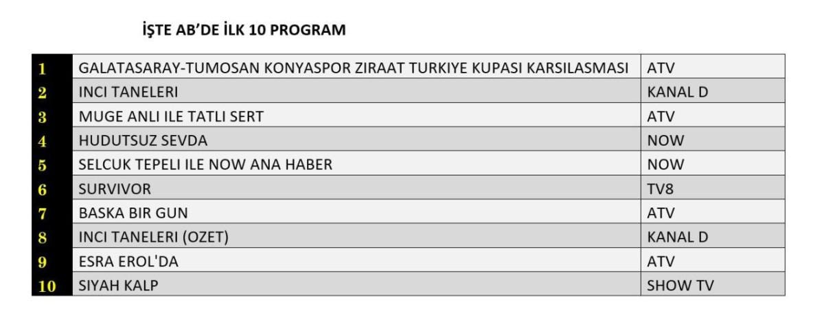 AB grubunda da Galatasaray-Tümosan Konyaspor Ziraat Türkiye Kupası Karşılaşması birinciliği kaptırmazken, İnci Taneleri dizisi ikinci sırada kendine yer buldu. Atv’nin yıllardır ilgiyle takip edilen programı Müge Anlı İle Tatlı Sert ise üçüncü oldu.