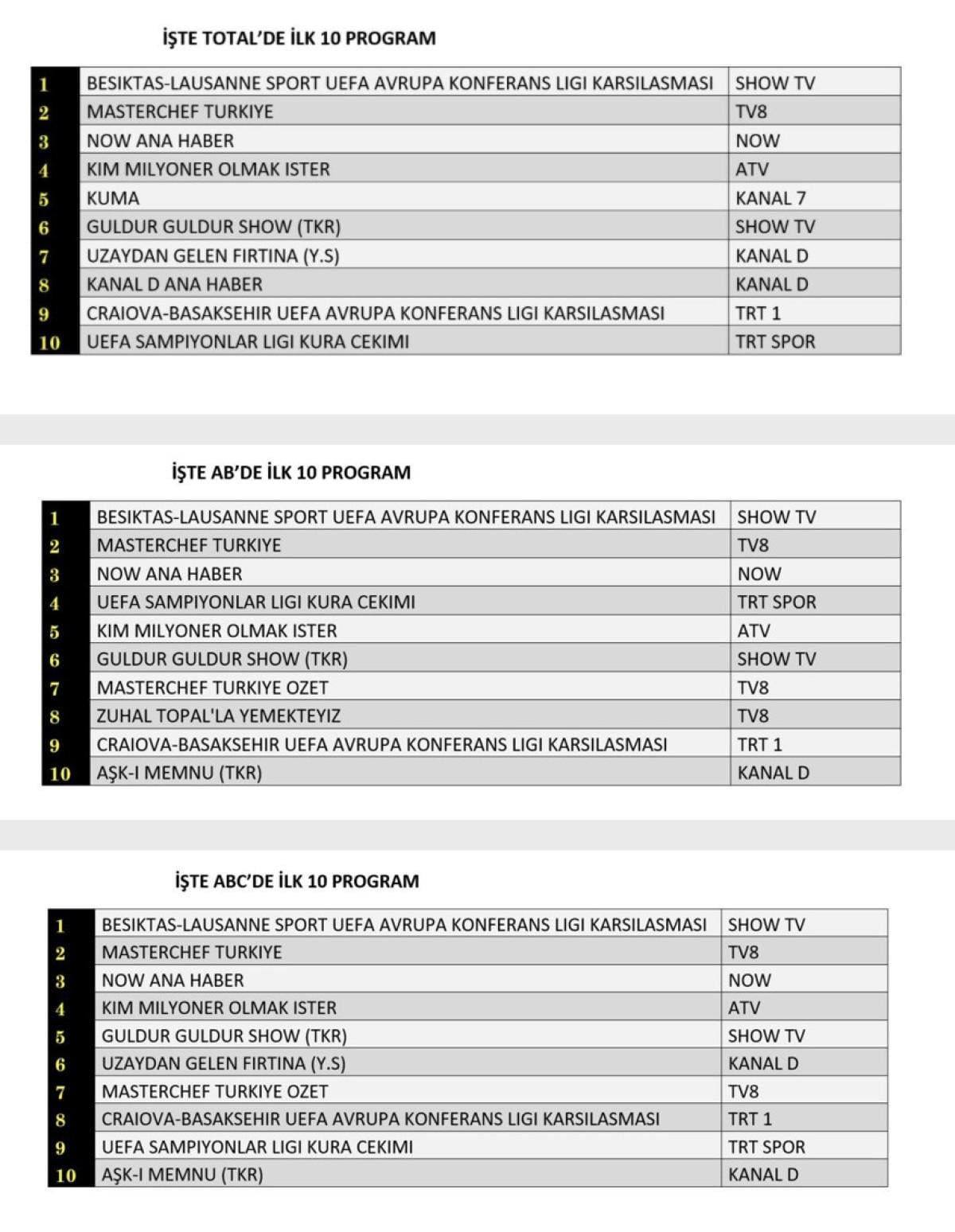 ABC kategorisinde ise birinci sırayı “Beşiktaş-Lausanne Sport UEFA Avrupa Konferans Ligi Karşılaşması” programı elde etti. İkinci sırada “Masterchef Türkiye”, üçüncü sırada ise “NOW Ana Haber” yer aldı.