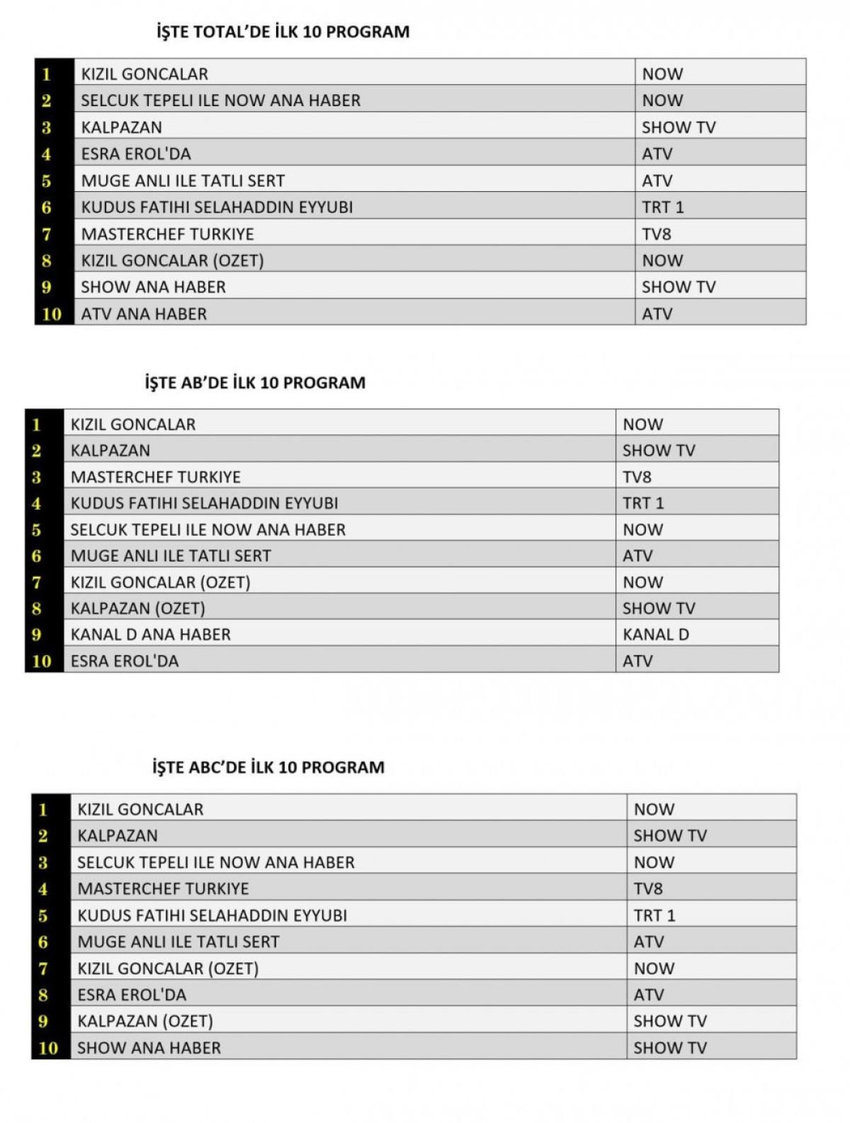 ABC kategorisinde de zirvede “Kızıl Goncalar” bulunurken, ikinci sırayı “Kalpazan” ve üçüncü sırayı “Selçuk Tepeli ile Now Ana Haber” aldı.