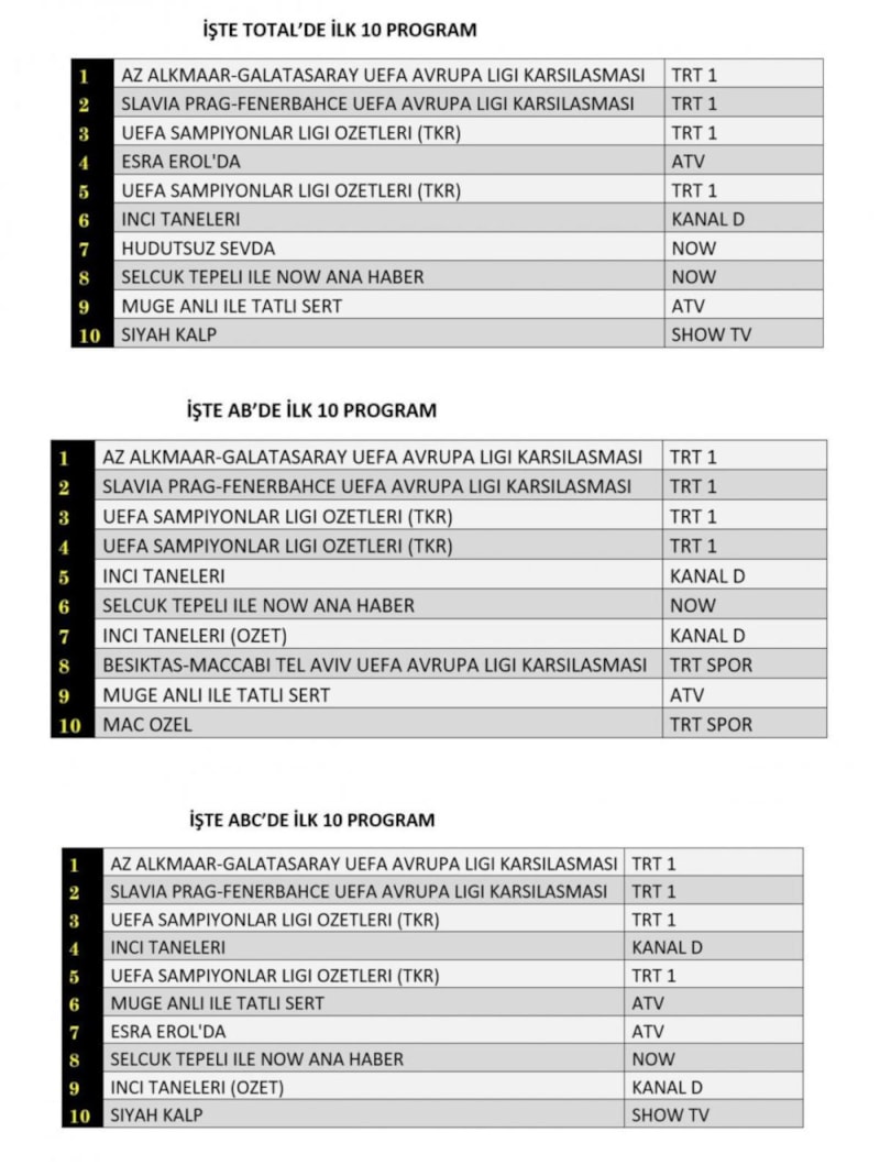 Total, AB ve ABC katagorisinde birinci sırada TRT1'de yayınlanan Az Alkmaar - Galatasaray UEFA Avrupa Ligi Karşılaşması, ikinci sırada TRT 1'de yayınlanan Slavia Prag - Fenerbahçe UEFA Avrupa Ligi karşılaşması,üçüncü sırada UEFA Şampiyonlar Ligi özetleri yer aldı.