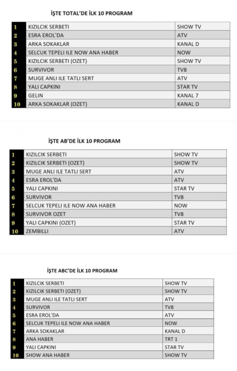 Her gün bir önceki güne ait Total, AB ve ABC sıralaması belli olurken dünün reyting sonuçları merakla bekleniyor.