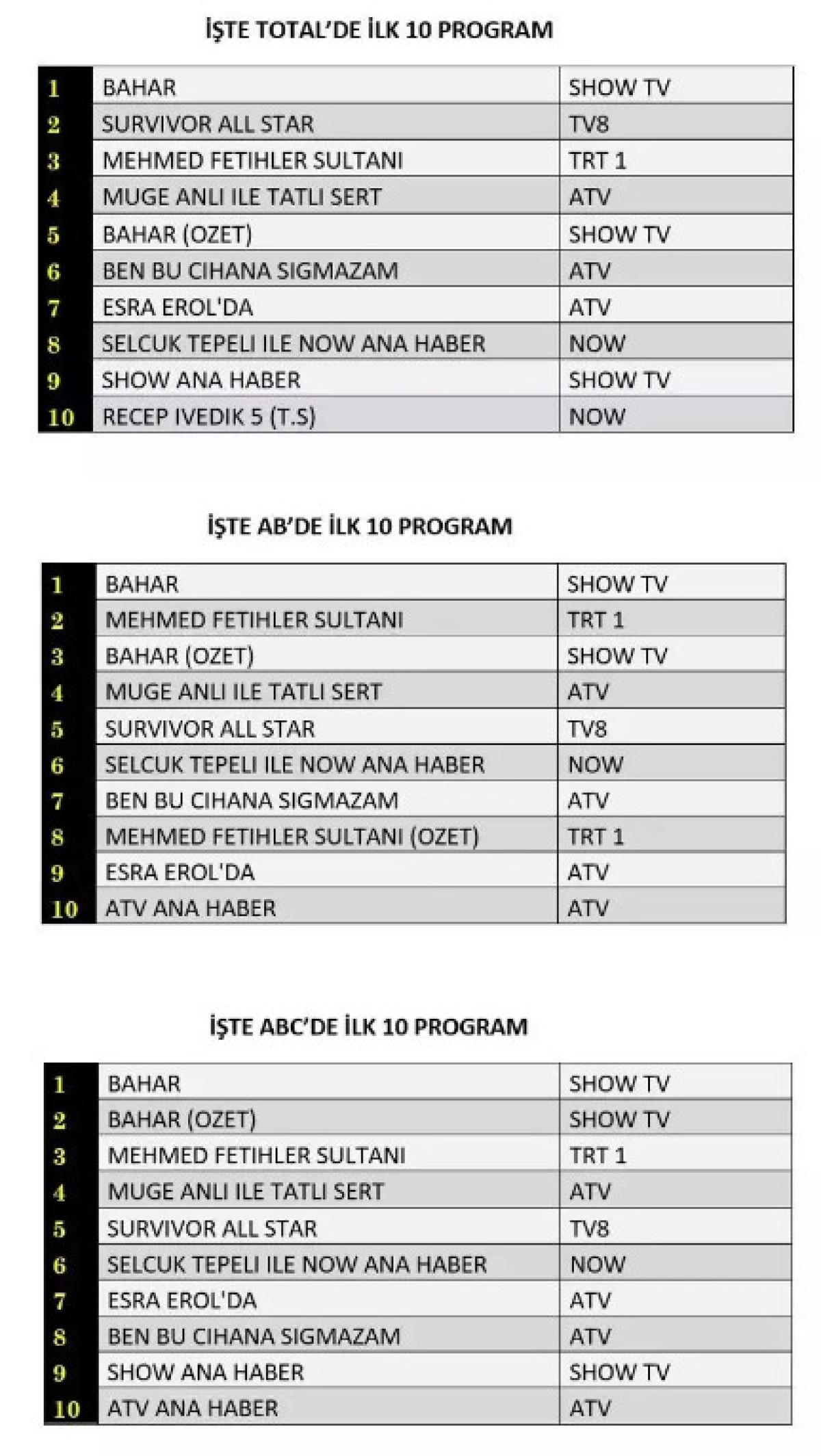Her gün bir önceki güne ait Total, AB ve ABC sıralaması belli olurken dünün reyting sonuçları merakla bekleniyor.