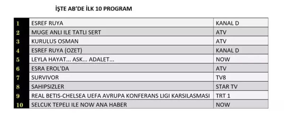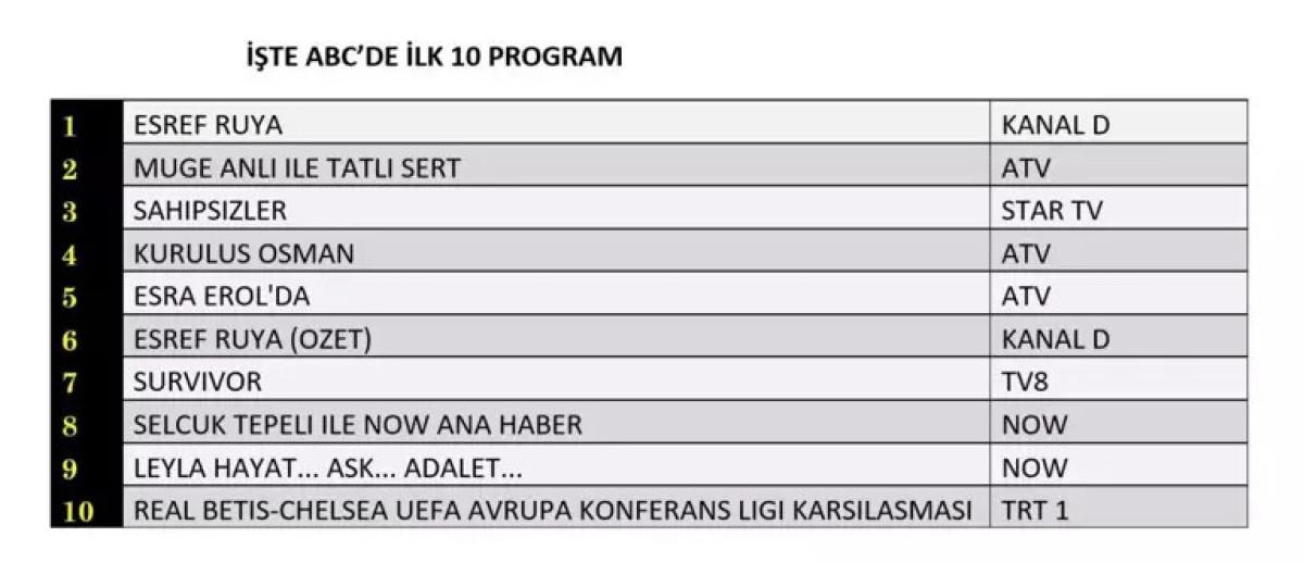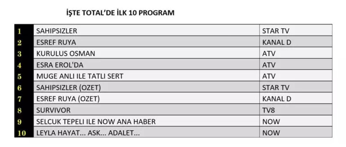 Her gün bir önceki güne ait Total, AB ve ABC sıralaması belli olurken dünün reyting sonuçları merakla bekleniyor.