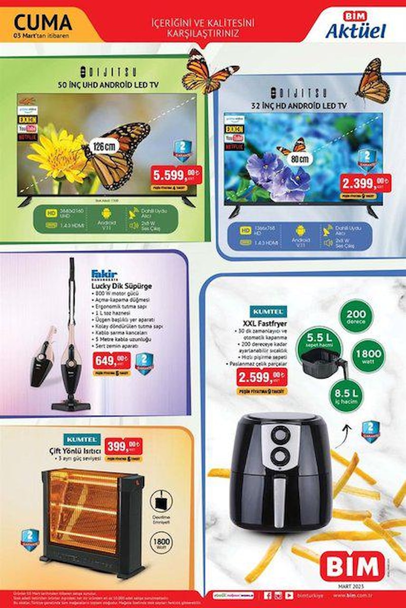 Türkiye'nin en büyük zincir marketlerinden biri olan BİM, 28 Şubat - 3 Mart aktüel ürünler kataloğu yayınlandı. Her hafta indirimli ürünleri satışa çıkaran BİM'de bu hafta televizyon, dik süpürge, çift yönlü ısıtıcı ve fastfryer geliyor.
