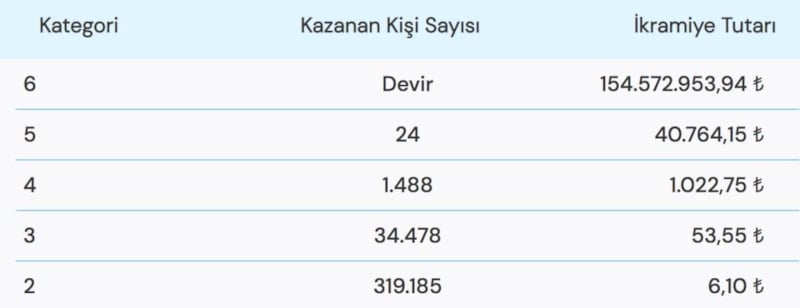 6 bilenin çıkmadığı çekiliş sonuçlarına göre büyük ikramiye devretti. İşte ikramiye kazanan kişi sayısı ve kazandıkları ödül miktarı..