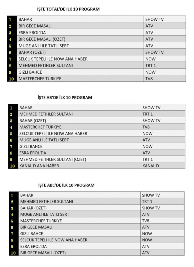 ABC1 kategorisinde 1. sırada “Bahar” dizisi zirvedeki yerini korudu. 2. sırada “Mehmed Fetihler Sultanı” dizisi yer aldı. 3. sırada ise “Bahar” dizisinin özeti dikkat çekti.