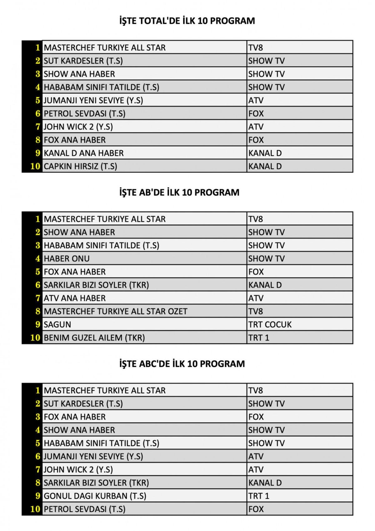 AB’de 1. sırada “MasterChef Türkiye All Star”, 2. sırada “Show Ana Haber”, 3. sırada ise “Hababam Sınıfı Tatilde” yer aldı.