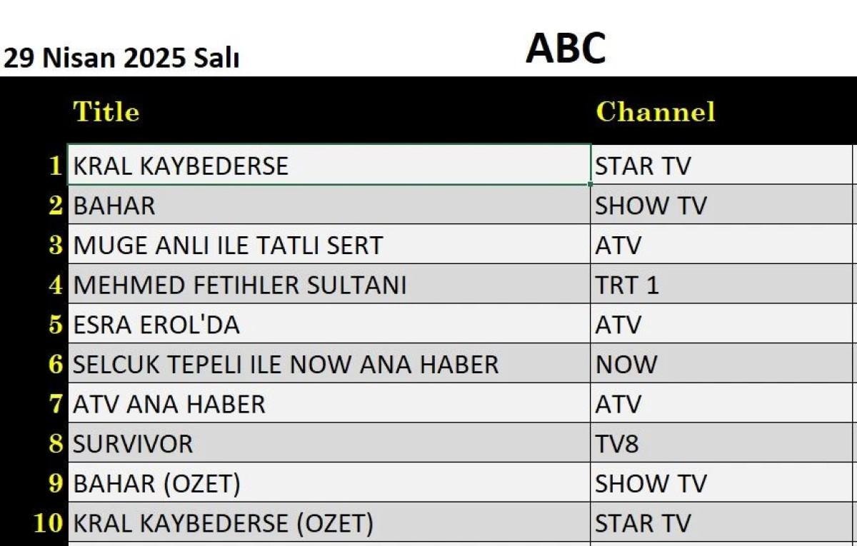Her gün bir önceki güne ait Total, AB ve ABC sıralaması belli olurken dünün reyting sonuçları merakla bekleniyor.
