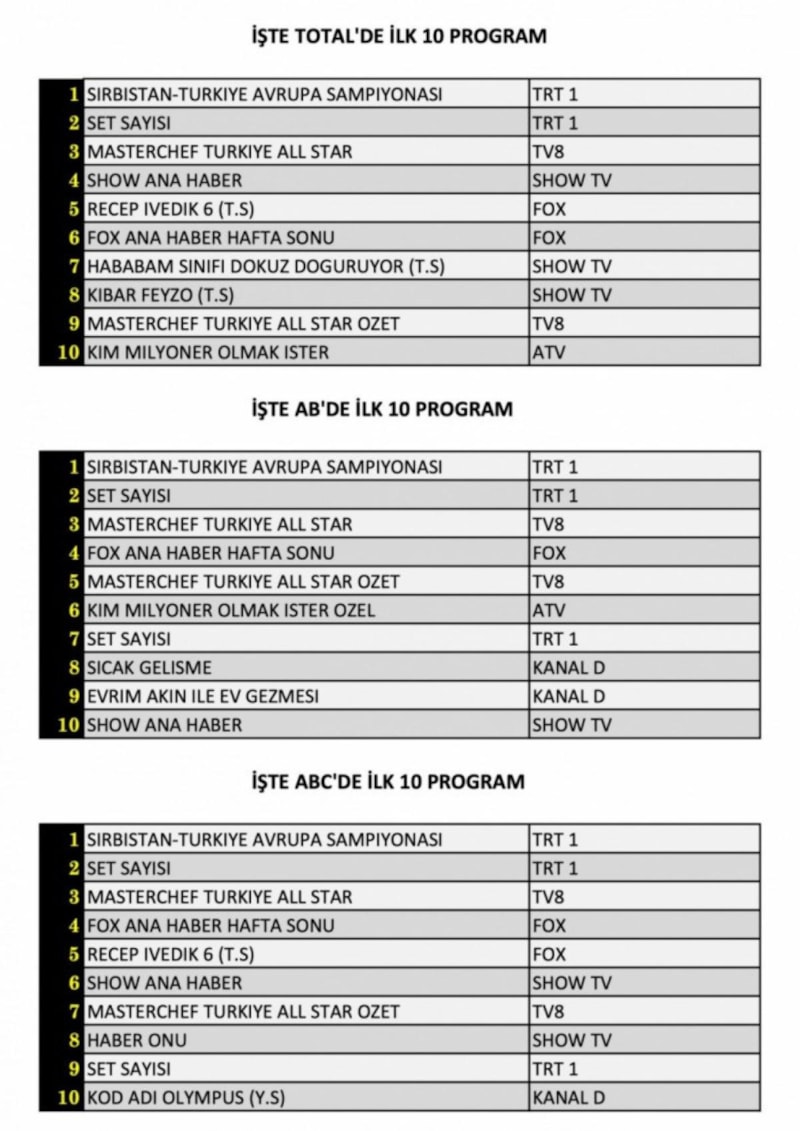 Her gün bir önceki güne ait Total, AB ve ABC sıralaması belli olurken dünün reyting sonuçları merakla bekleniyor.