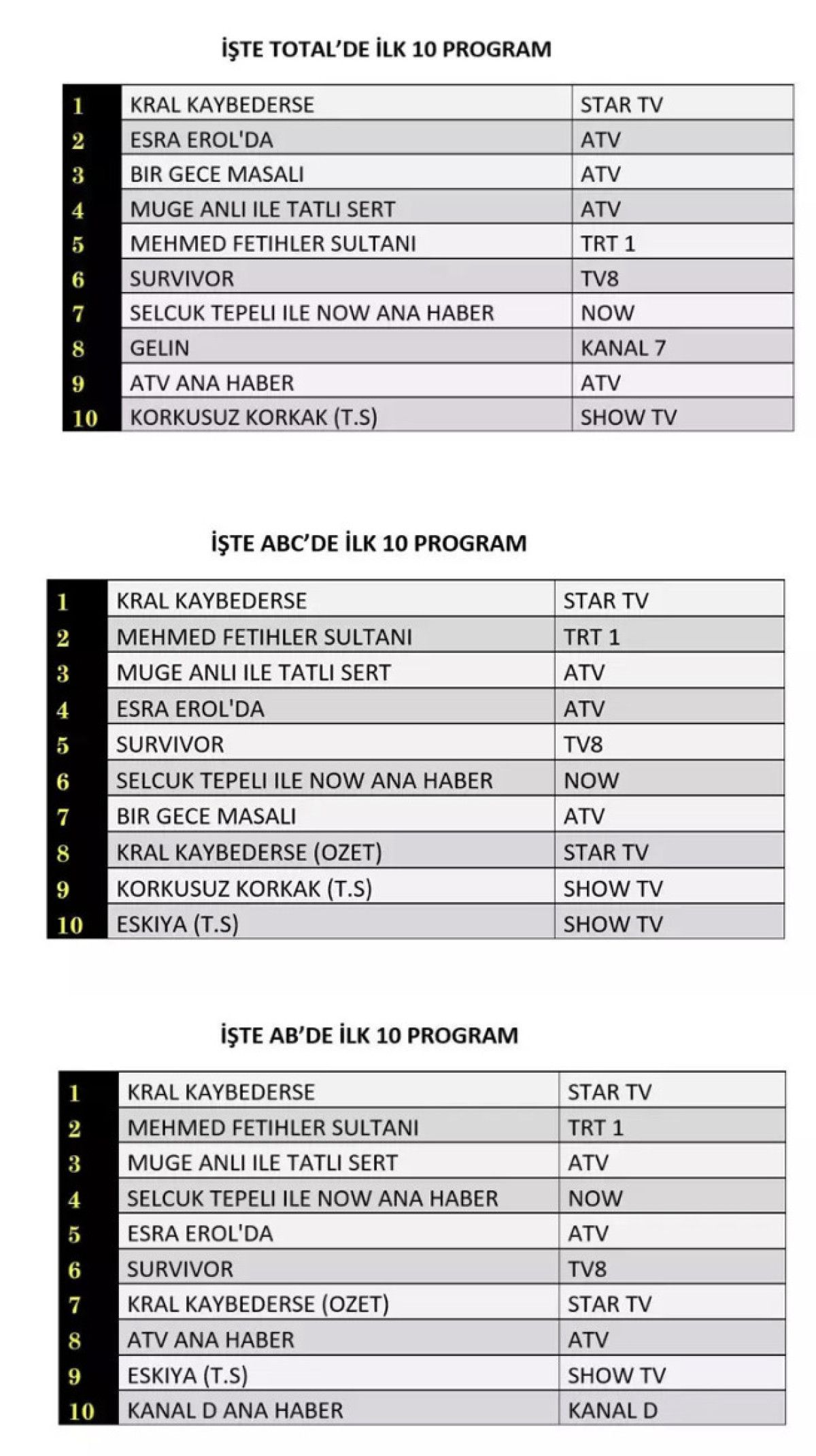 Her gün bir önceki güne ait Total, AB ve ABC sıralaması belli olurken dünün reyting sonuçları merakla bekleniyor.