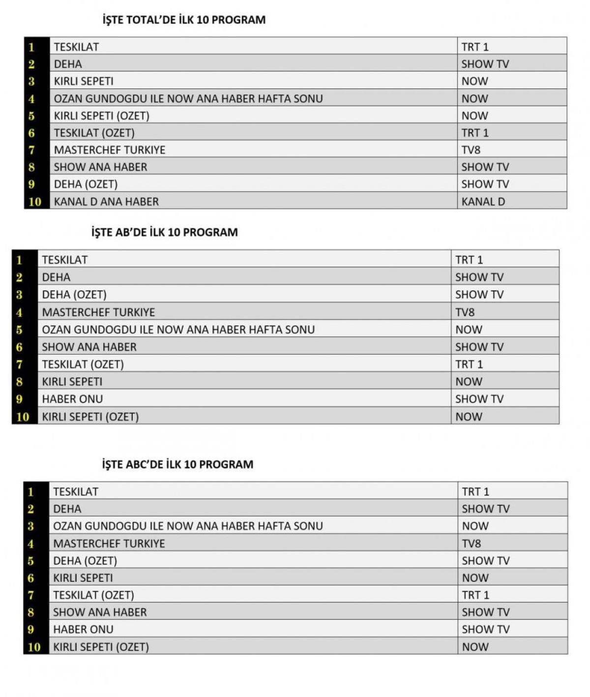 ABC kategorisinde de ilk sırada "Teşkilat" yer alırken, onu Show TV’nin "Deha" dizisi ve üçüncü sırada "Ozan Gündoğdu İle Now Ana Haber Hafta Sonu" takip etti.