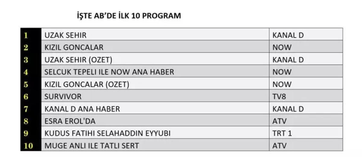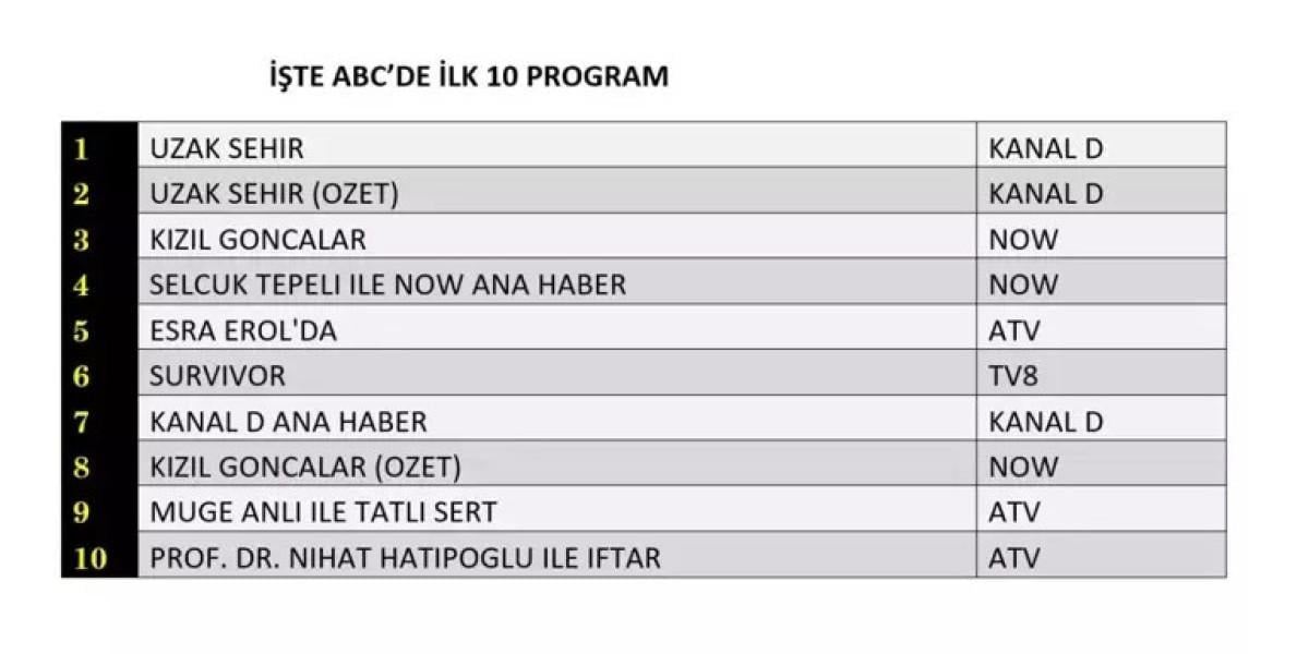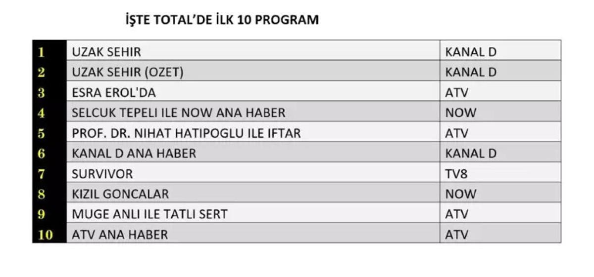 Her gün bir önceki güne ait Total, AB ve ABC sıralaması belli olurken dünün reyting sonuçları merakla bekleniyor.